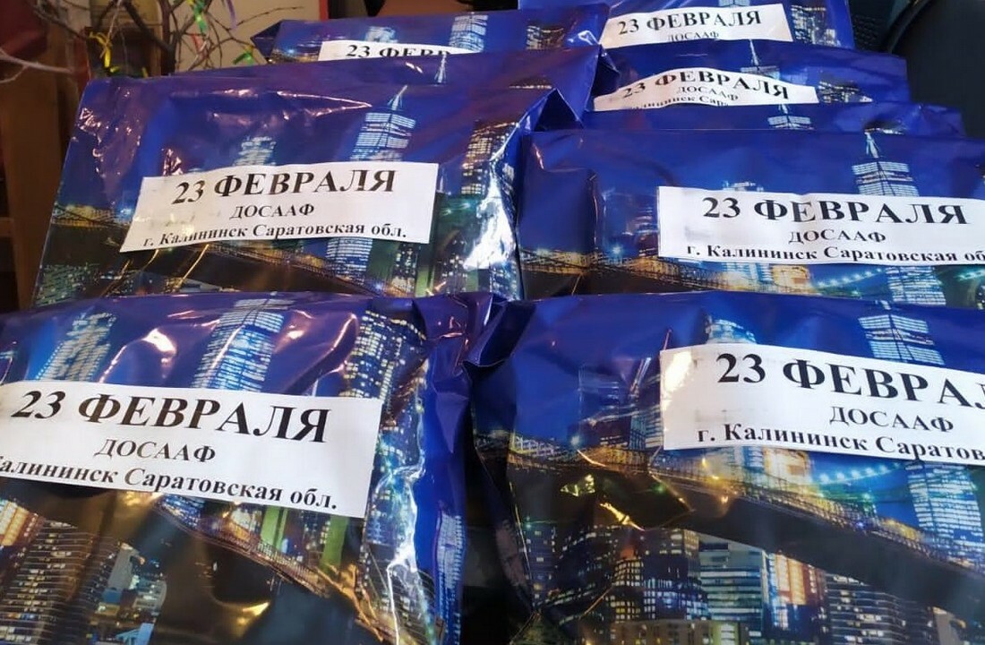Сотрудники ПОУ «Калининская школа ДОСААФ», проявляя внимание и теплоту, собрали 10 подарков для земляков, в которые вложены предметы первой необходимости: бельё, балаклавы, носки, зубные пасты, мыло, консервы, печенье. В посылках вложены открытки к Дню защитника Отечества с тёплыми и искренними пожеланиями и словами поддержки им, нашим воинам.