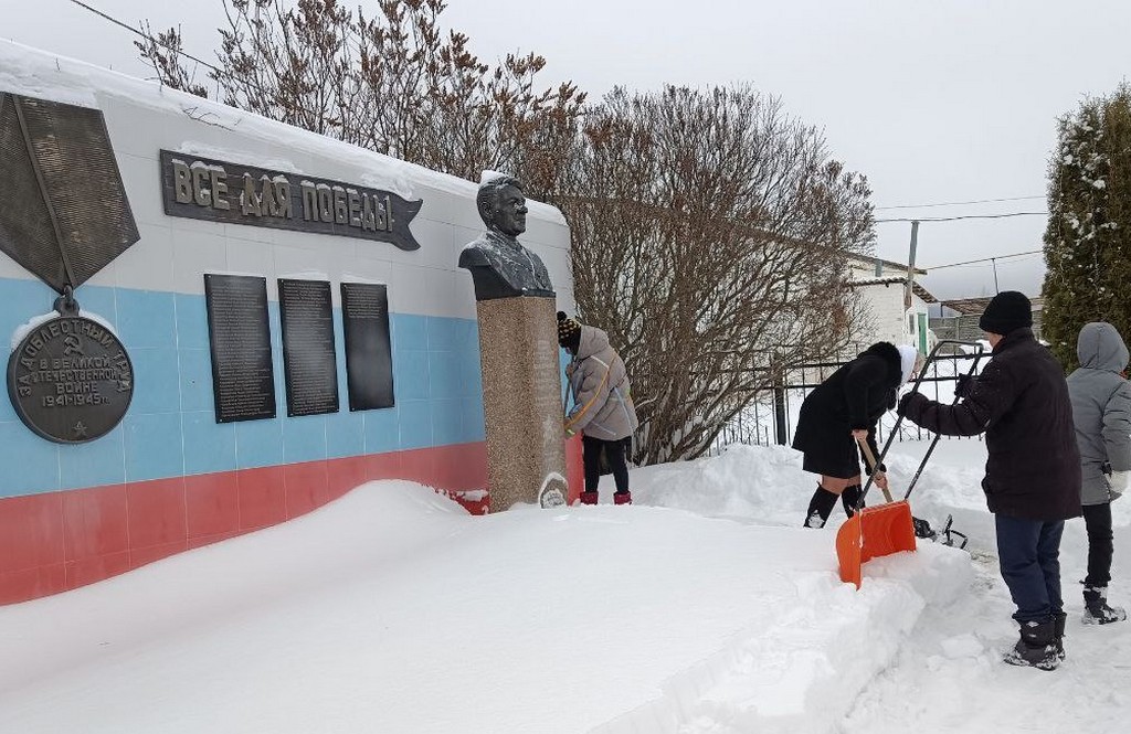 После снегопада школьники всех школ района расчистили от снега территории около памятников воинам-землякам.