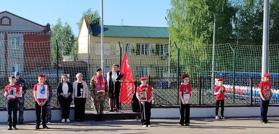Юные патриоты прошли по школьному двору «победным строем». В руках каждого из них портреты героев: дедов, прадедов, бабушек и прабабушек, всех, кто сражался на фронтах или ковал победу в тылу. Ребята гордо держали в руках изображения своих предков.