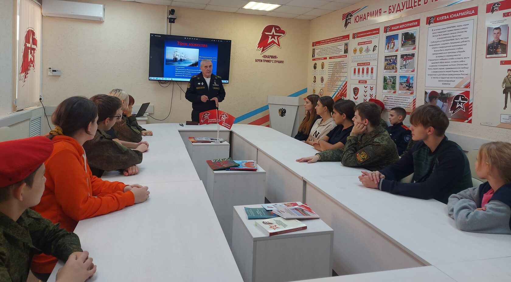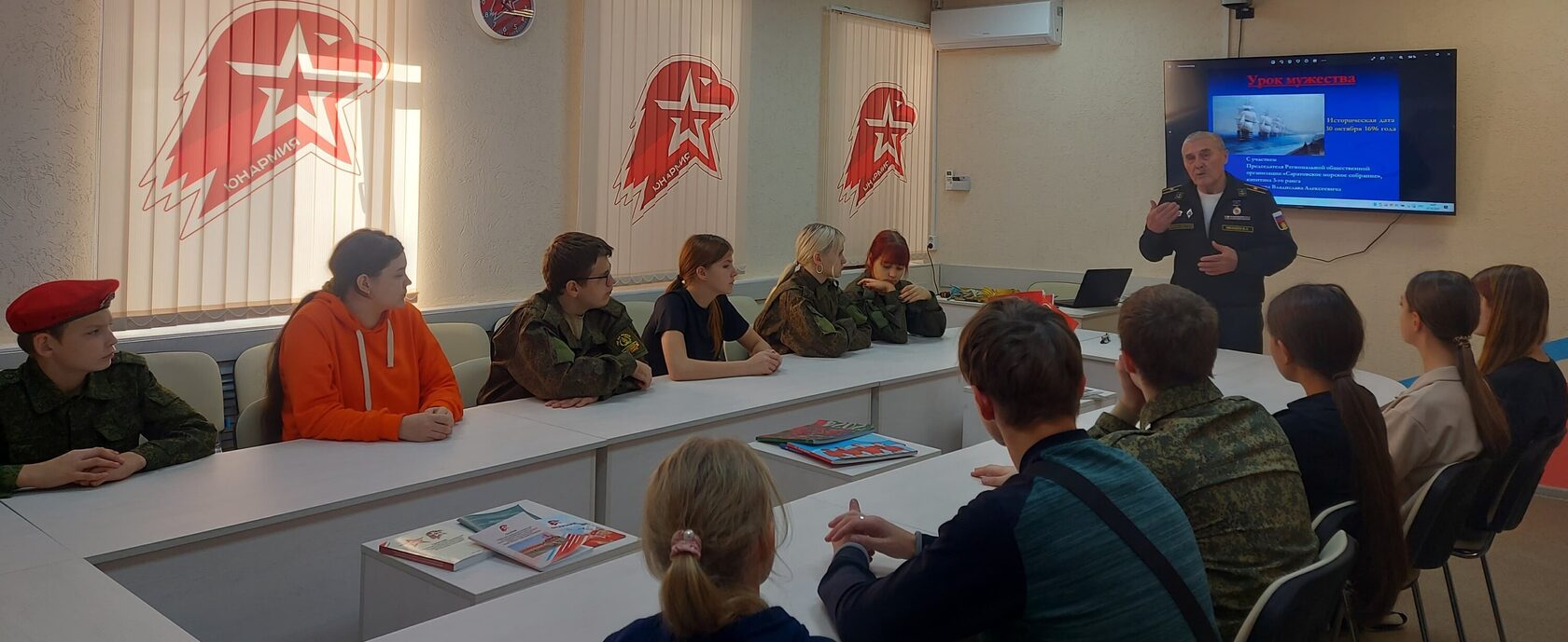 Урок мужества с учащимися школ Заводского района г. Саратова состоялся на базе Учебно-методического центра военно-патриотического воспитания молодёжи «АВАНГАРД». Его провёл заместитель председателя Саратовской областной организацией ветеранов, председатель Саратовского морского собрания, капитан 3 ранга В.А. Иванов. Темой встречи стали — 329-я годовщина образования Российского военно-морского флота и День моряка-надводника.