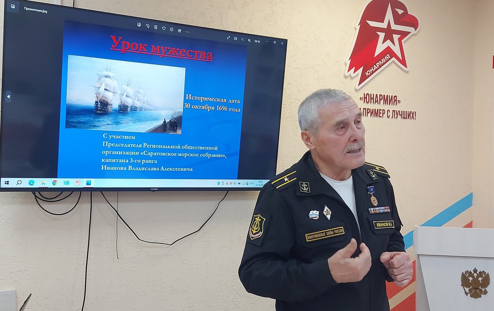 В ходе реализации постановления Правительства Саратовской области №212-П от 13 марта 2025 года по проведению мероприятий, направленных на патриотическое воспитание, сохранение исторической памяти о подвиге советского народа в Великой Отечественной войне Саратовской областной организацией ветеранов в партнёрстве с региональным центром допризывной подготовки молодёжи к военной службе и военно-патриотического воспитания Саратовской области 21 октября 2025 г. проведён Урок мужества «Морская мощь и сила страны», посвящённый 80-летию Великой Победы и Году защитника Отечества.