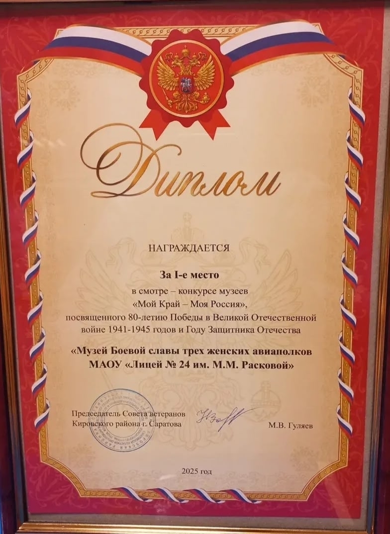 В ходе реализации постановления Правительства Саратовской области №212-П от 13 марта 2025 года по проведению мероприятий, направленных на патриотическое воспитание, сохранение исторической памяти о подвиге советского народа в Великой Отечественной войне Саратовской областной организацией ветеранов в партнёрстве с администрацией, ветеранской организацией (председатель — М.В. Гуляев) Кировского района и лицеем №24 им. М.М. Расковой г. Саратова 18 ноября 2025 г. проведён творческий конкурс «Мой Край — моя Россия», посвящённый 80-летию Великой Победы и Году защитника Отечества.