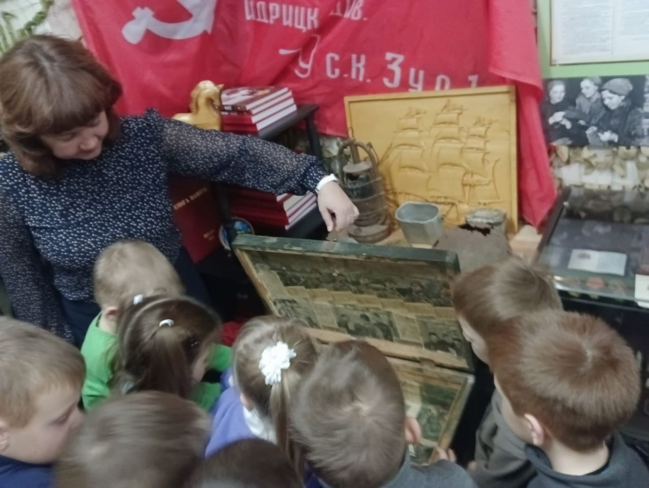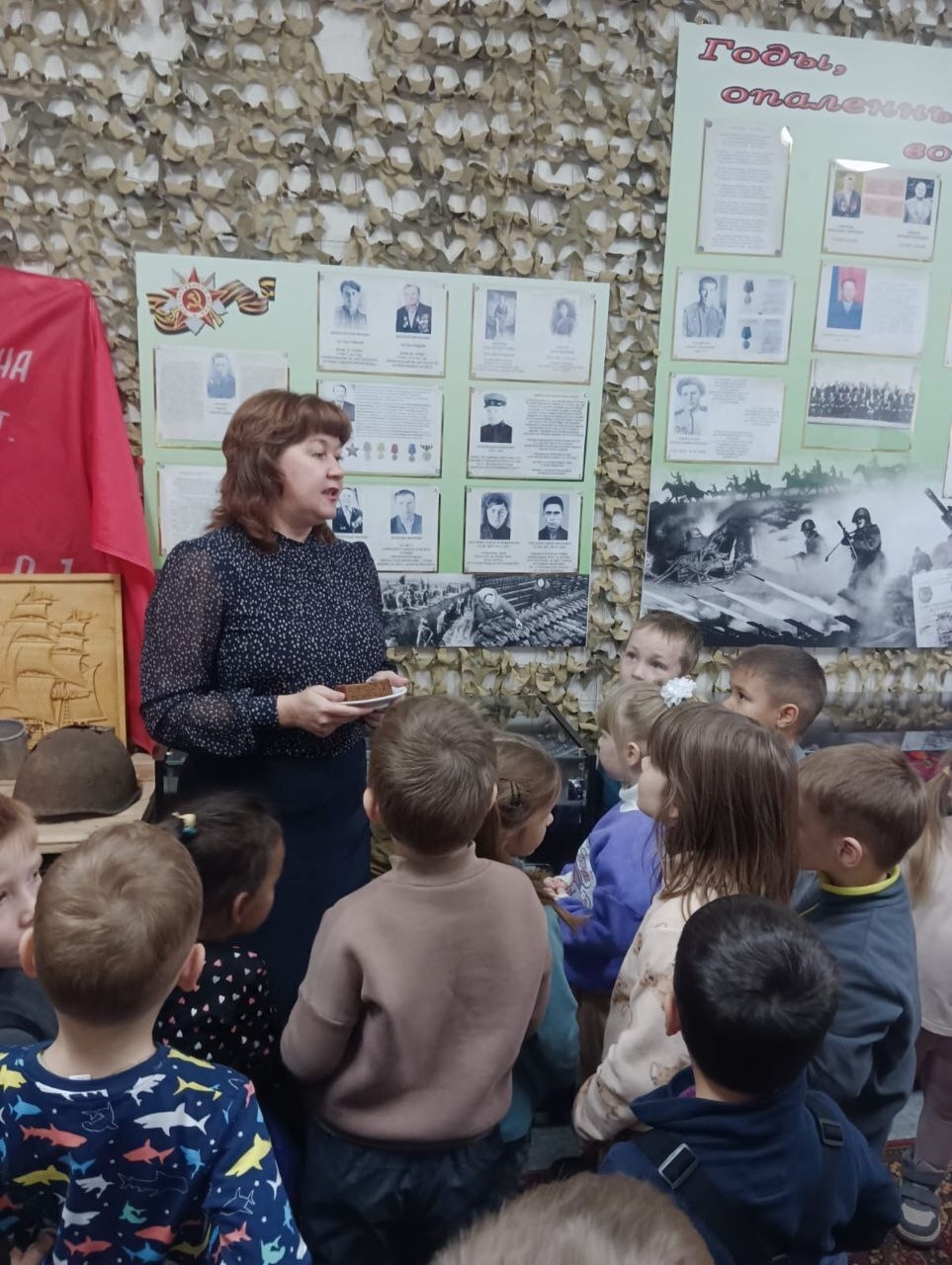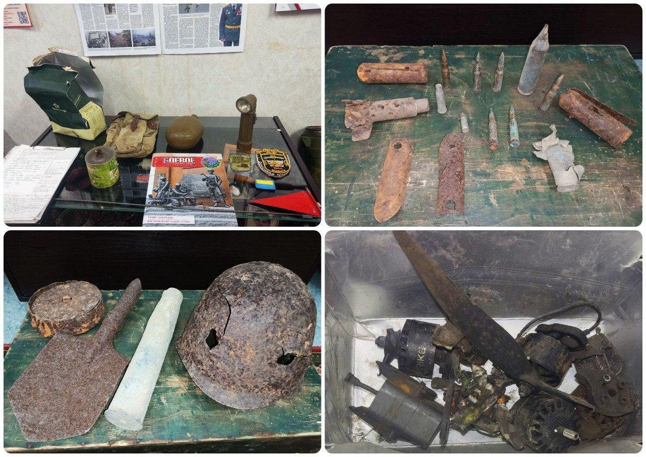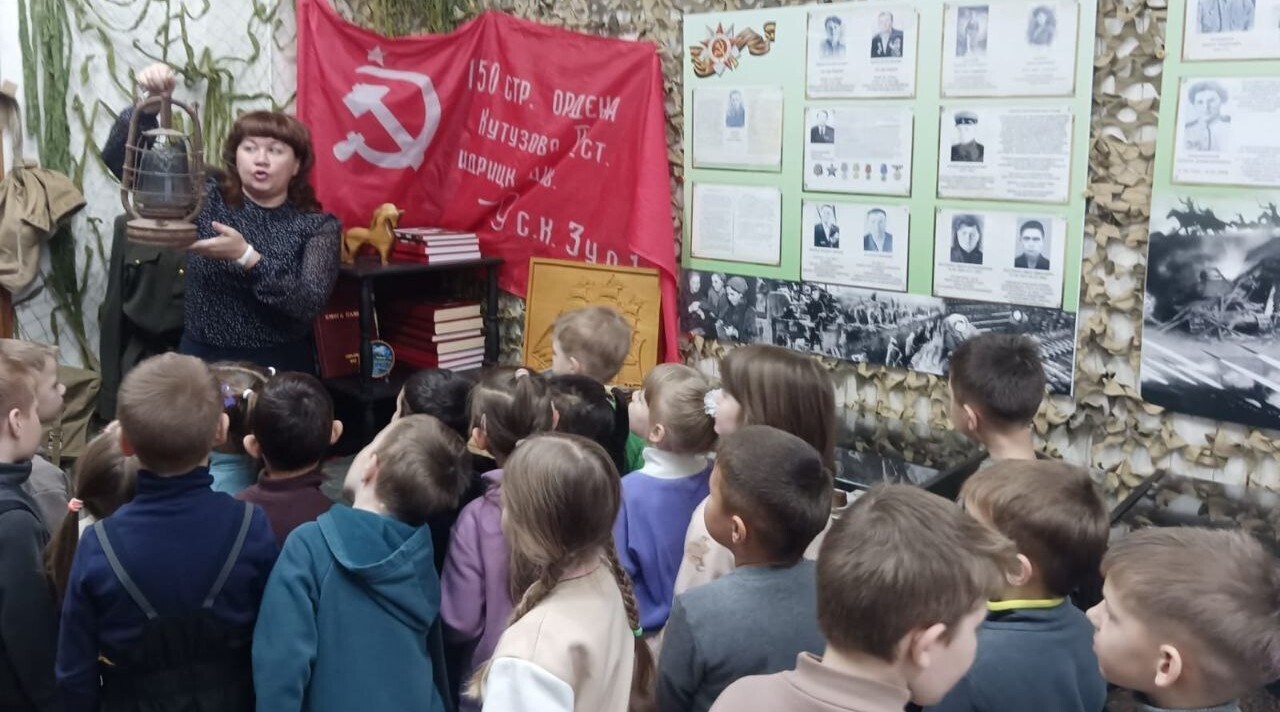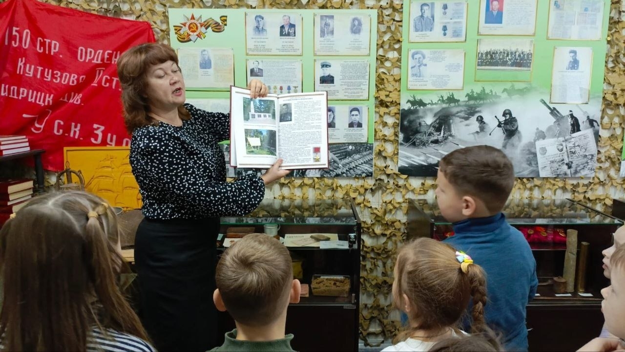 Дети с большим интересом слушали экскурсовода Шевченко Ксению, задавали вопросы, рассматривая экспонаты. Среди них каски, гранаты, фляжки, пушечные гильзы, личные вещи участников боевых действий, переданные их родственниками. Также были представлены стенды с фотографиями, документами, письмами, книгами.