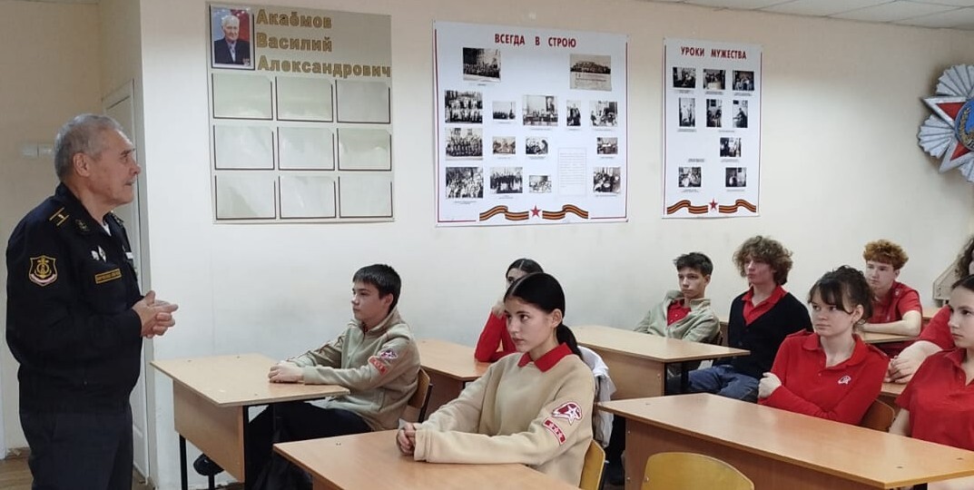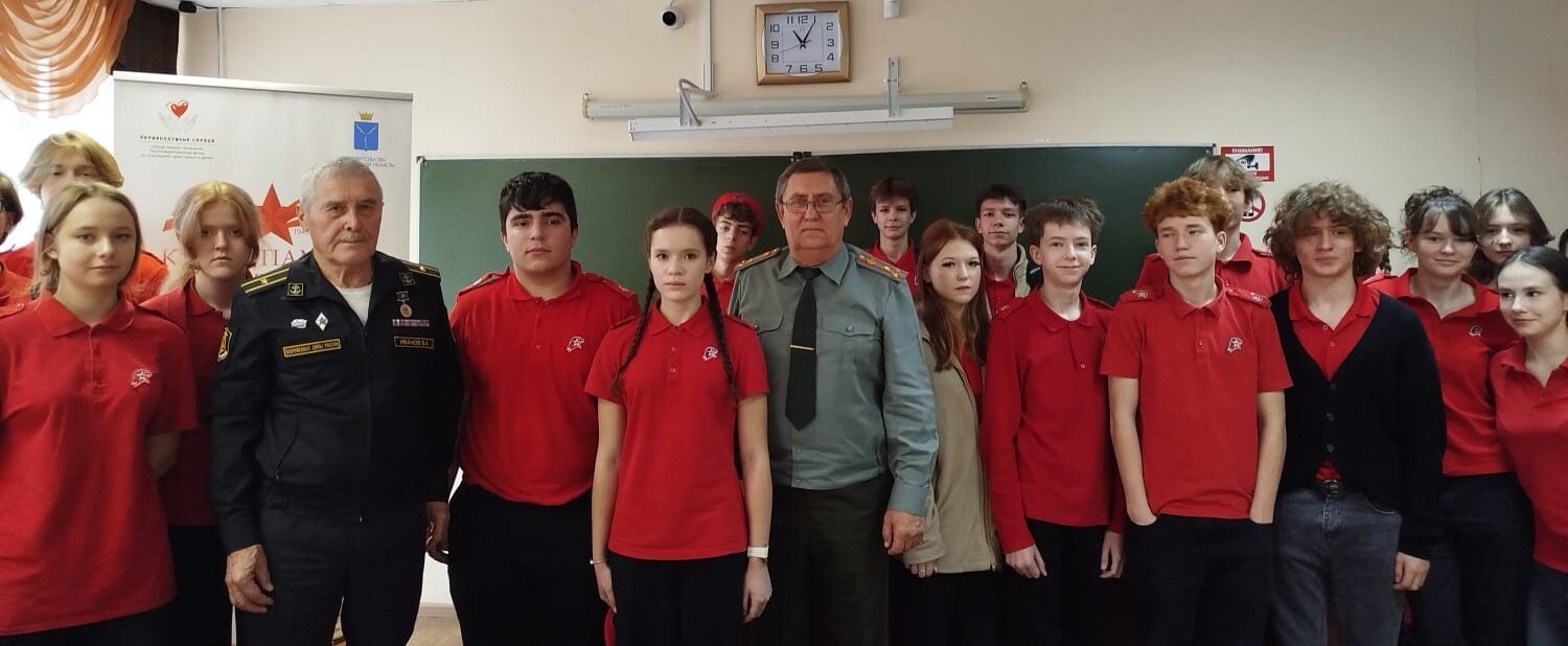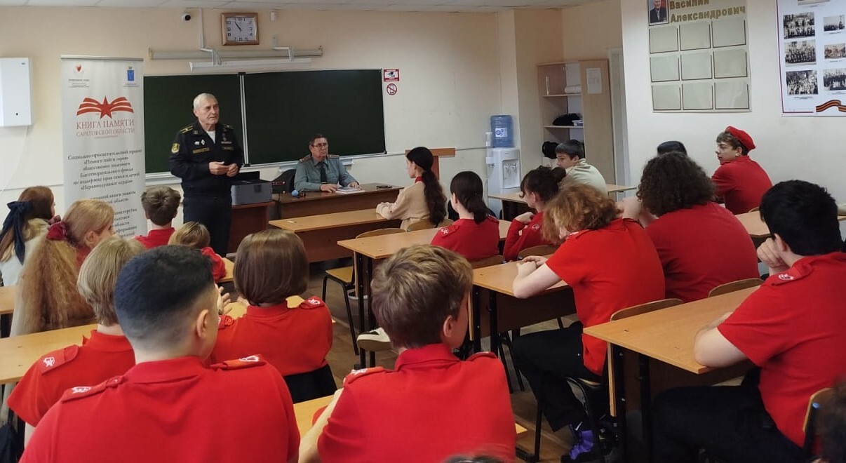 Урок мужества с учащимися 10 «Б» класса гимназии №31 г. Саратова провели заместитель председателя Саратовской областной организацией ветеранов, председатель Саратовского морского собрания, капитан 3 ранга В.А. Иванов и ветеран военной службы кандидат военных наук, полковник в отставке А.А. Самойлов, много лет преподававший в Вольском военном институте тылового обеспечения ВС РФ.
