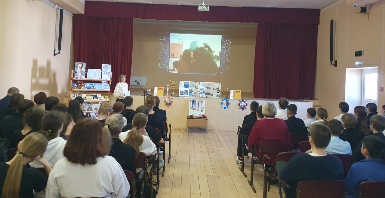 В актовом зале «СОШ п. Дубки» Урок мужества в формате беседы провели председатель регионального отделения Саратовской области Федерации вертолётного спорта России, лётчик-инструктор Саратовского аэроклуба Тамара Амелькина и военный лётчик-снайпер, участник военных действий в локальных войнах, спортсмен-пилот Саратовского аэроклуба, член сборной России по вертолётному спорту, неоднократный призёр чемпионатов России и победитель кубка России Александр Казаков.