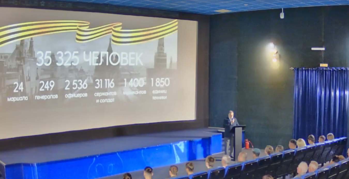 В зале кинотеатра перед участниками выступил — член бюро городской ветеранской организации ветеранов, председатель региональной общественной организация «Союз Саратовских курсантов», подполковник в отставке Александр Гранков. Он рассказал о подготовке этого исторического парада, о составе и числе участников, о вооружении и боевой технике.