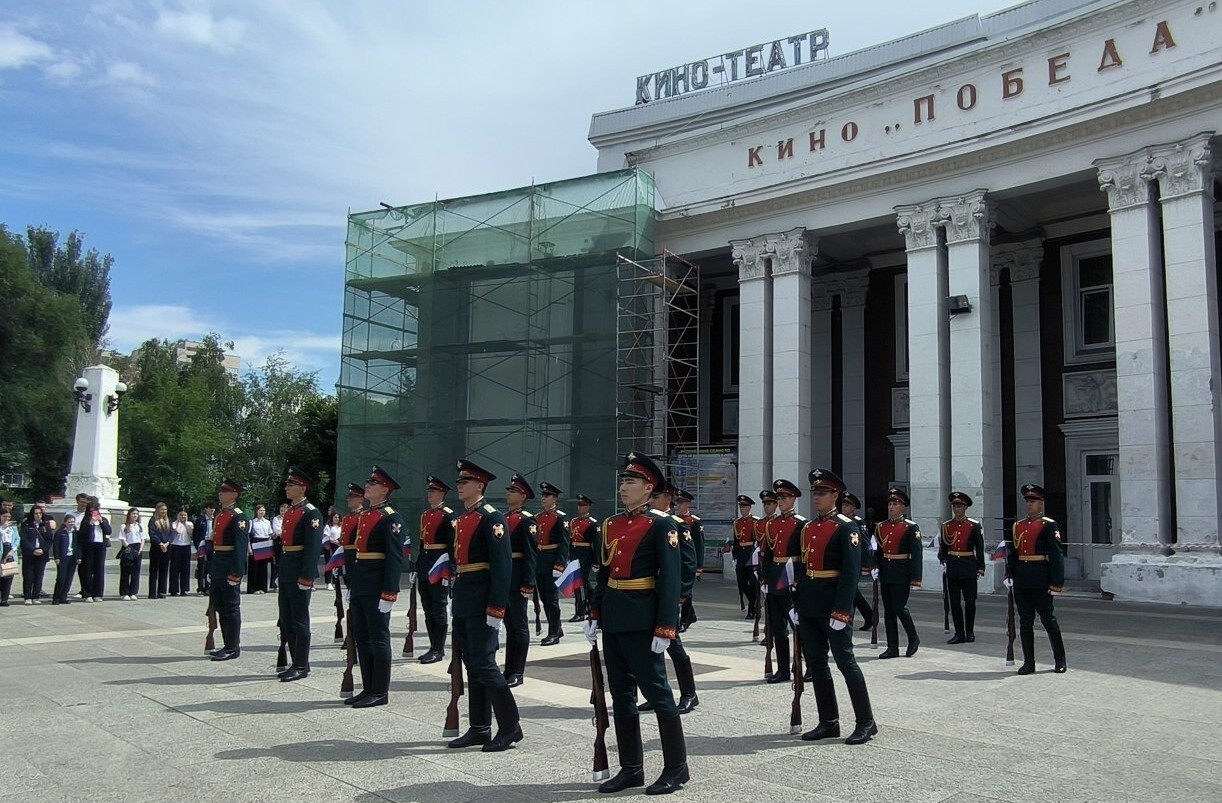 На площади перед входом в кинотеатр оркестр Саратовского военного ордена Жукова Краснознаменного института войск национальной гвардии РФ исполнил военные марши, а его солисты пели песни военного времени.