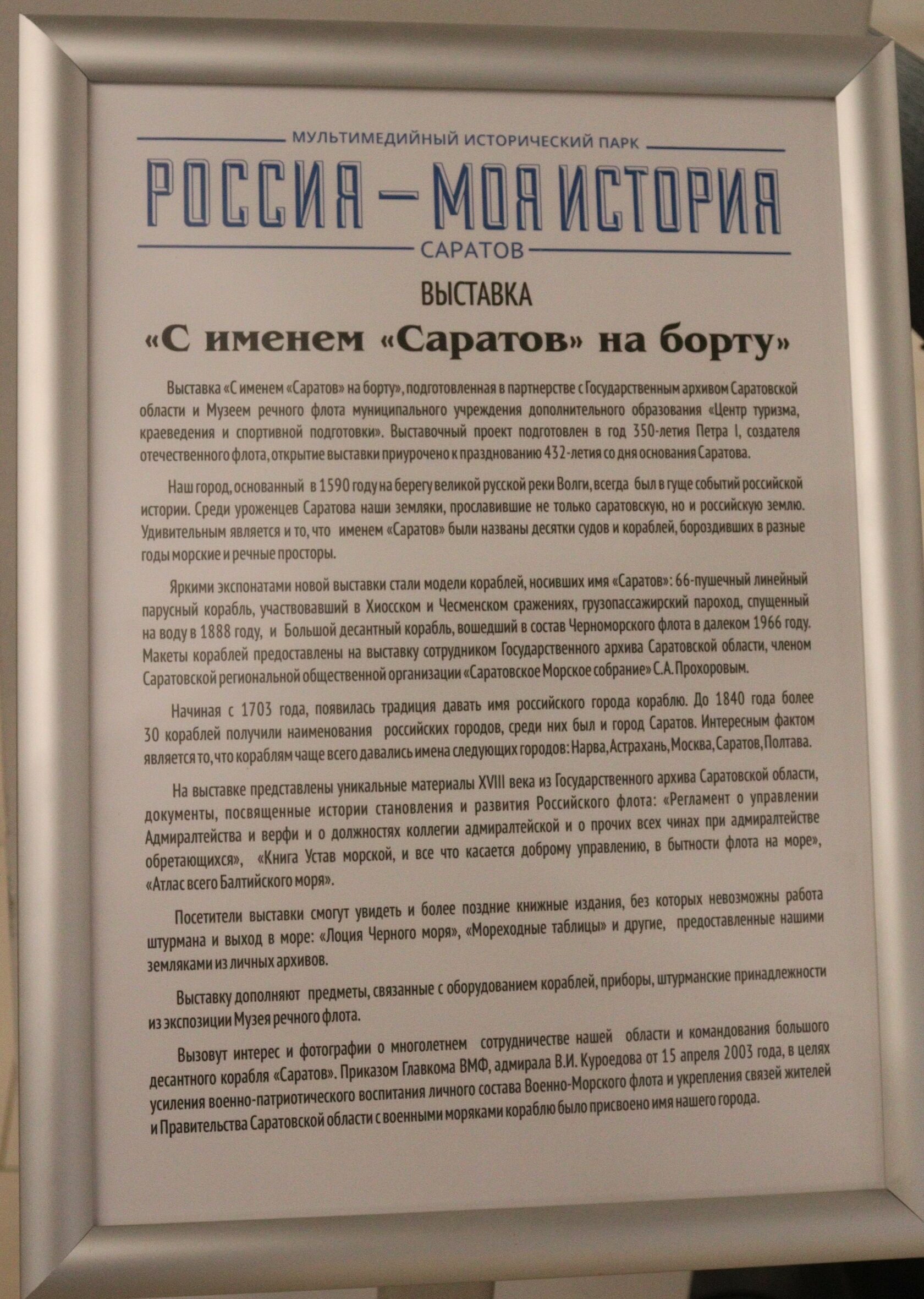 Проект подготовлен музеем «Россия — моя история» в партнёрстве с Государственным архивом Саратовской области и Музеем речного флота «Центра туризма, краеведения и спортивной подготовки». Открыл выставку ударом в судовой колокол ветеран Военно-Морского флота А.И. Чернышов.
